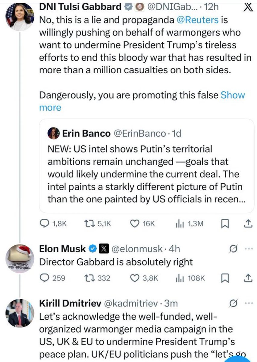 Już następnego dnia szefowa amerykańskiego wywiadu, znana z głęboko prorosyjskiej postawy Tulsi Gabbard, powiedziała że to kłamstwo, że Rosja chce pokoju i to wspaniali ludzie są. I tutaj macie screena, który wydawał mi się nieprawdopodobny, że aż zadałem sobie trud wyszukania odpowiedniego fragmentu na Twitterze. Da się, choć to żmudne. W skrócie Tulsi pisze o „warmongerach” (u nas rosyjscy agenci nazywają ich „pobrzękującymi szabelką”) a wtóruje jej Elon Musk, iż „Director Gabbard is absolutely right” oraz… specjalny wysłannik Putina, wysłany właśnie do USA, Kiriłł Dmitrijew, pisząc o spisku mediów i „warmongerów”, mającym na celu zerwanie planu pokojowego prezydenta Trumpa.
