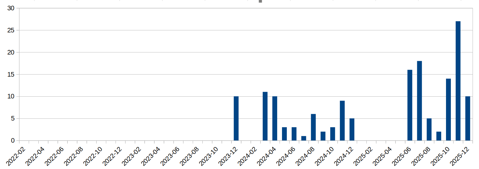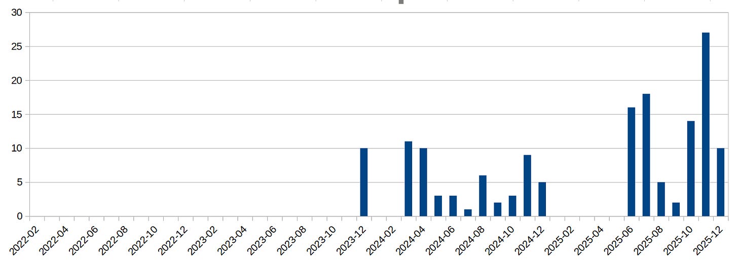5. Wracajmy więc do naszych odgrzewanych strachów, czyli do „Kindżała” - ostatnio wspominałem, że coś go za często widuję. I w końcu się wziąłem i po krótkiej, choć frustrującej walce, uzyskałem taki wykres. Pieniędzy ani godności osobistej na niego nie stawiajcie, bo bazuje na bardzo pobieżnie zbieranych danych i sam traktuję go jako sugestię, żeby temu się przyjrzeć, ale nawet wstępnie wydaje się, że „Kindżały” ostatnio używane są bardzo rozrzutnie. Patrz kolejny schemat, ten z niebieskimi słupkami.