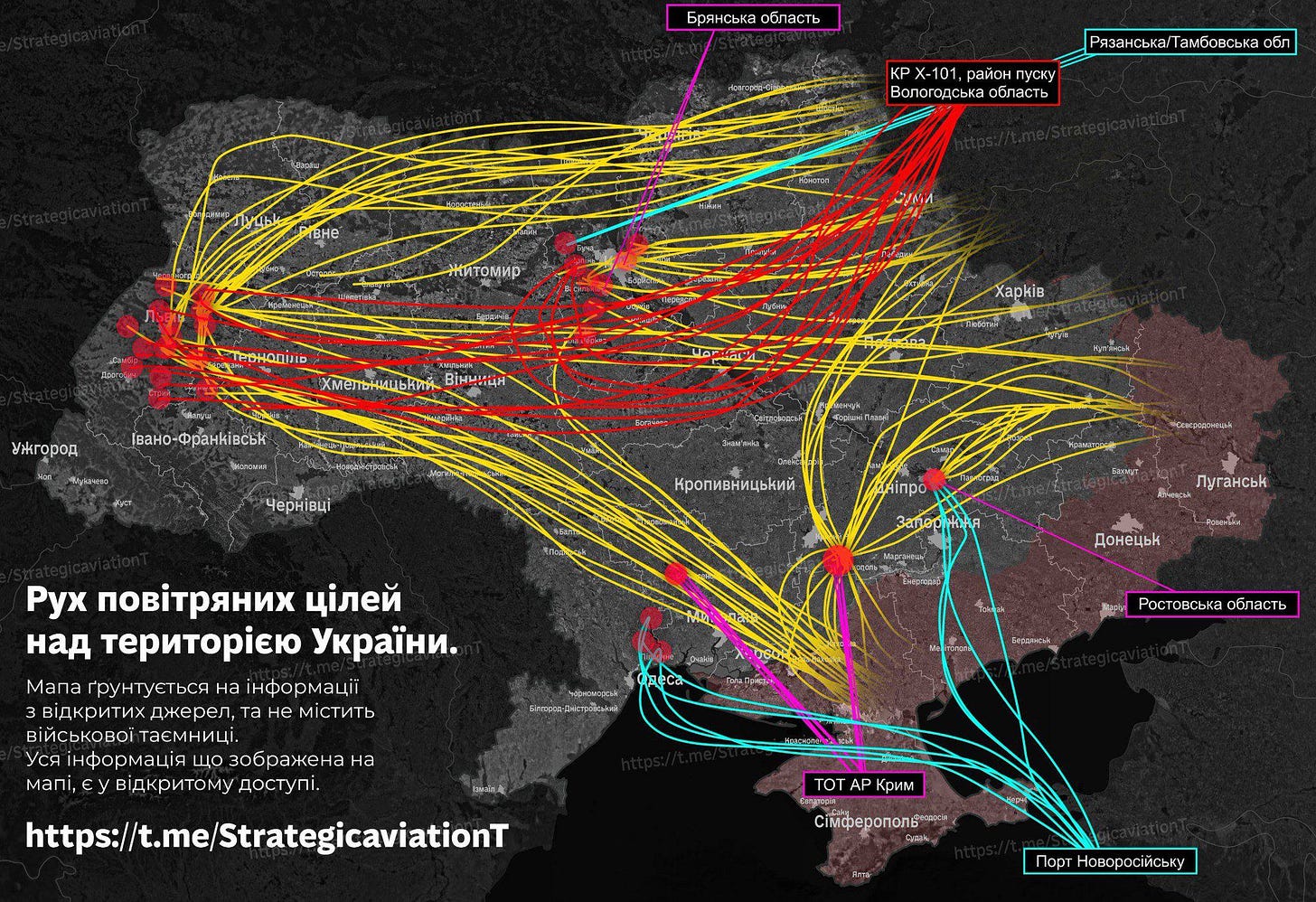 7. Tak na marginesie - popatrzcie na mapkę z orientacyjnym przebiegiem ataku z nocy z 5 na 6 grudnia. To był jeden z tych większych - 51 rakiet, 653 aparaty latające różnej maści. Skierowany w znacznej części na miasta zachodniej Ukrainy. I wiecie co? Jakoś tym razem „przypadkiem” nic nie przeleciało, choć było przy samej granicy.