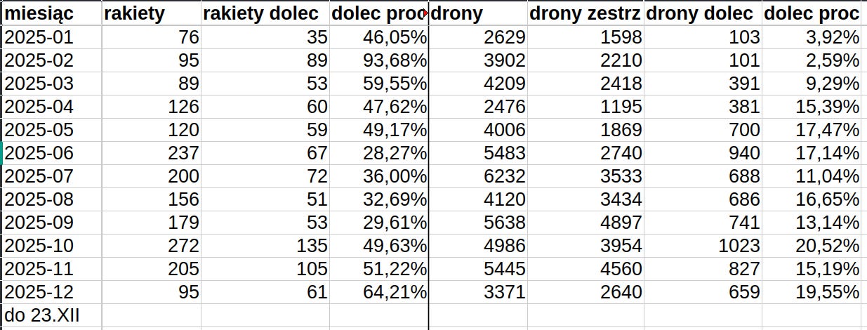 1. Nie mamy jeszcze pełne grudnia, choć od ostatniego podsumowania ataków powietrznych upłynął miesiąc (ale nie planuję tego, samo wychodzi), wiec będziemy musieli troszkę szacować i poruszać się z większą niepewnością, niż do tej pory. Najpierw rzućcie okiem na pierwszą tabelkę, która pokazuje, ile rakiet i dronów Rosjanie wystrzelili w danym miesiącu i ile doleciało.