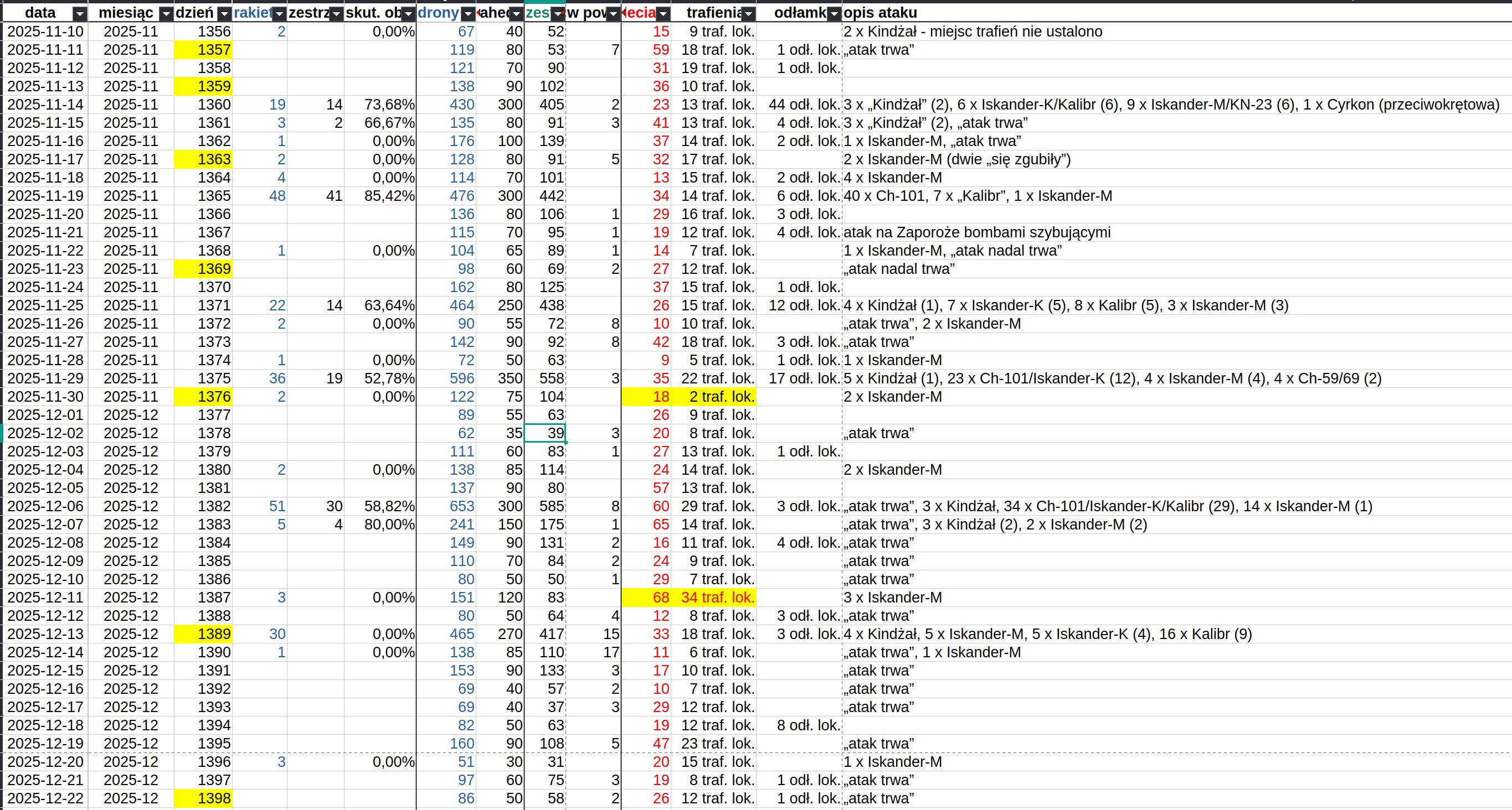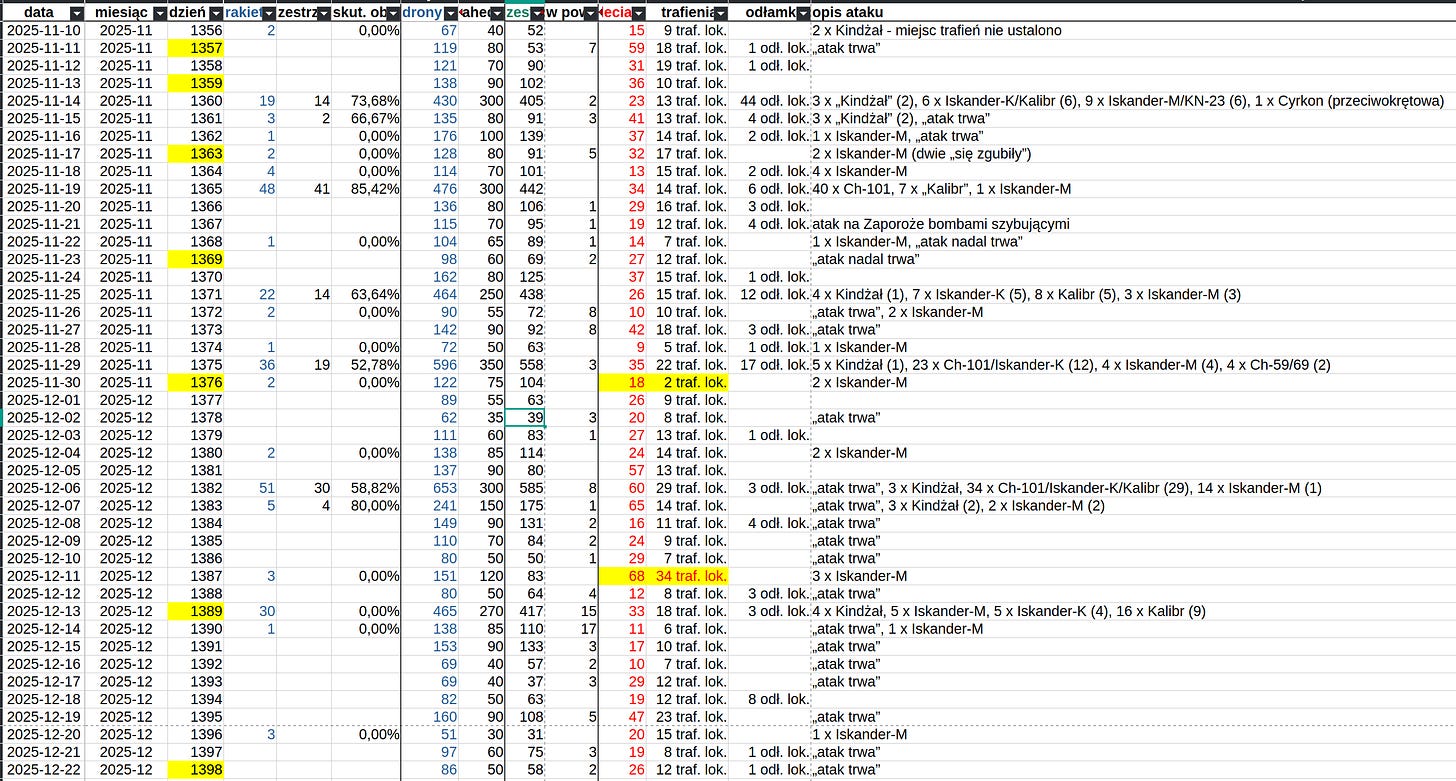 Jeśli chodzi o ilości wykorzystanych dronów to niby obecnie jest mniej, niż miesiąc temu, ale porównując miesiąc do miesiąca Rosjanie mogą nadrobić, wystarczą dwa silne ataki albo jeden widowiskowy. Czego zresztą się spodziewam, bo jeśli popatrzycie na błękitną kolumnę o nazwie „drony” w drugiej tabelce, to zobaczycie że ostatnio liczba dron bardzo, bardzo spada - to może być próba akumulacji do ataku na święta.