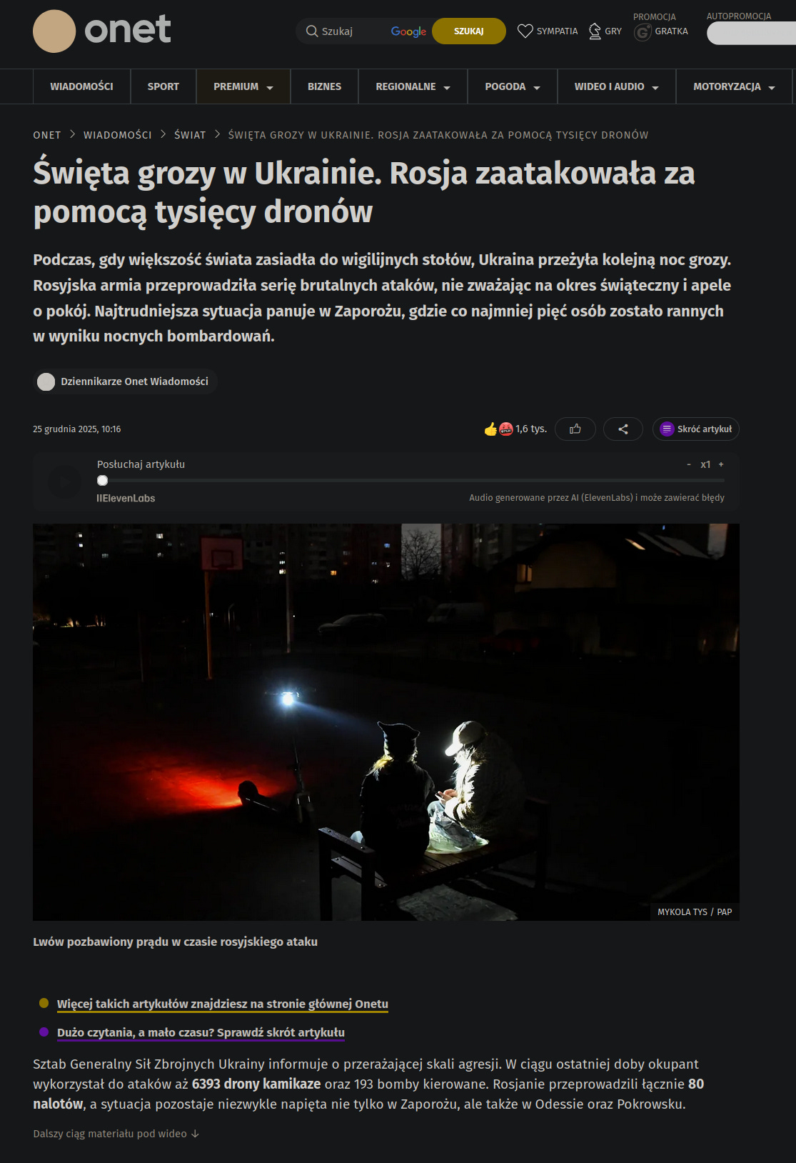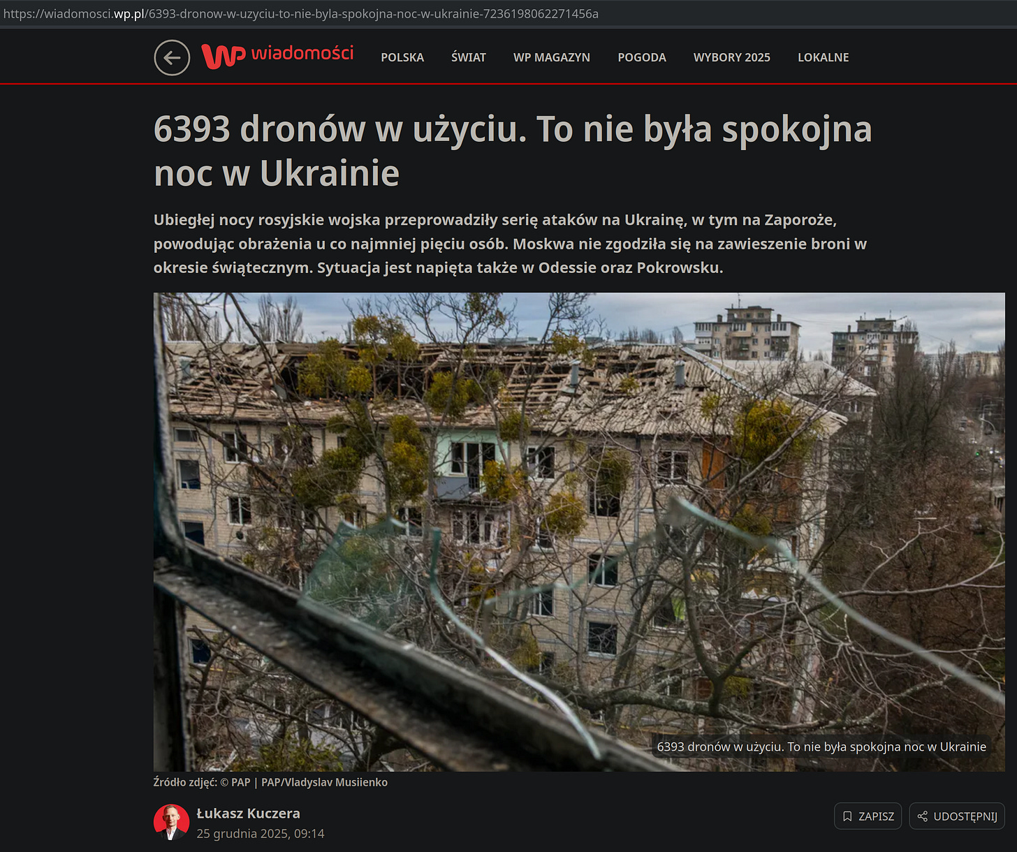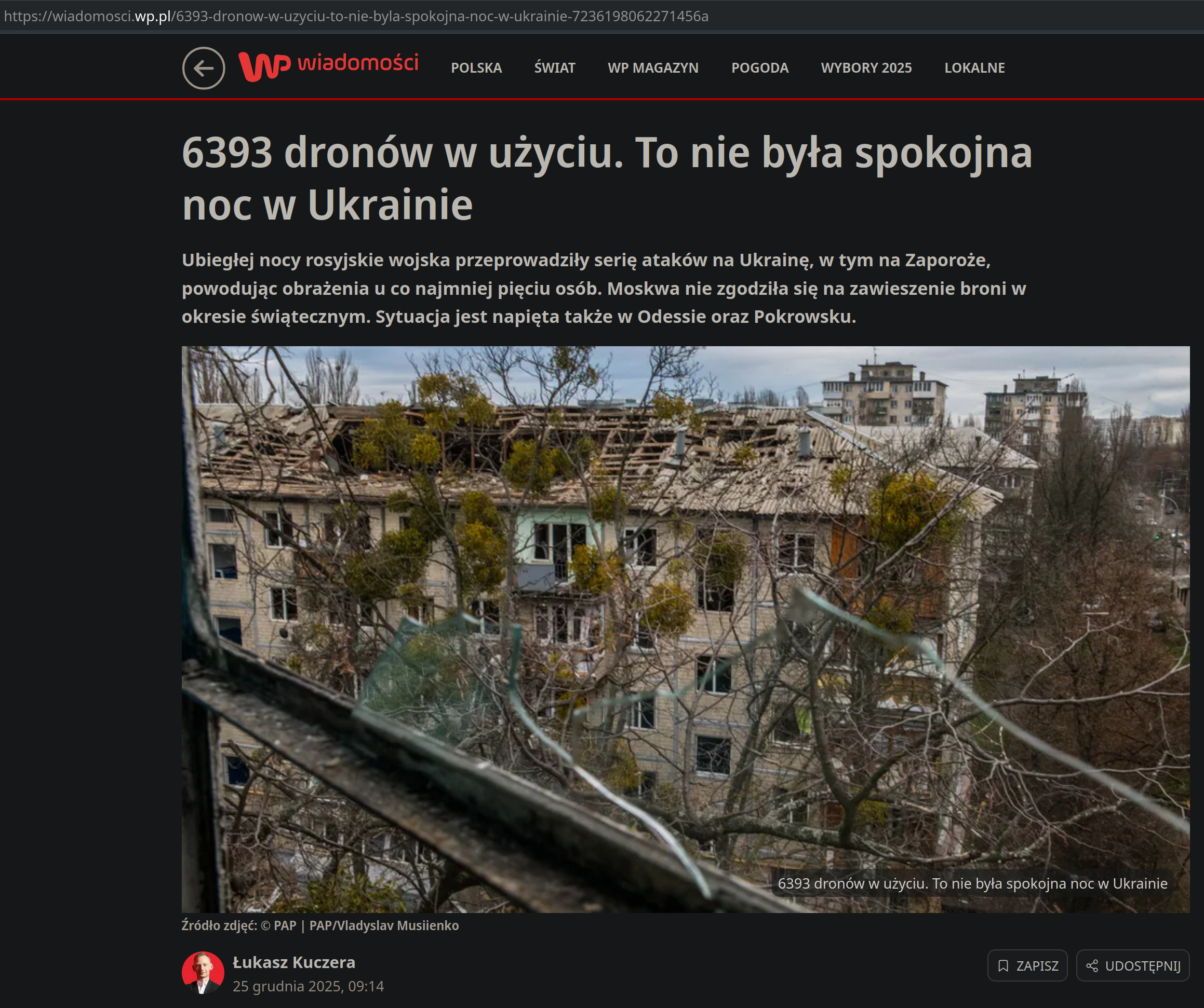 Niezależnie od tego przeglądam też polskie serwisy. I dziś rano zrobiłem oczy jak spodki, czytając „6393 dronów w użyciu. To nie była spokojna noc w Ukrainie” albo „Święta grozy w Ukrainie. Rosja zaatakowała za pomocą tysięcy dronów”. Skojarzenie miałem takie, jak zapewne mają wszyscy - nasze media podają co jakiś czas informacje o atakach lotniczych na Ukrainę, więc ten musiał by być gargantuiczny. Ale tytuły, nagłówki i sposób relacjonowania nie pozostawiały wątpliwości - w ten sposób opisywano do tej pory wszystkie ataki rakietowo/dronowe.
