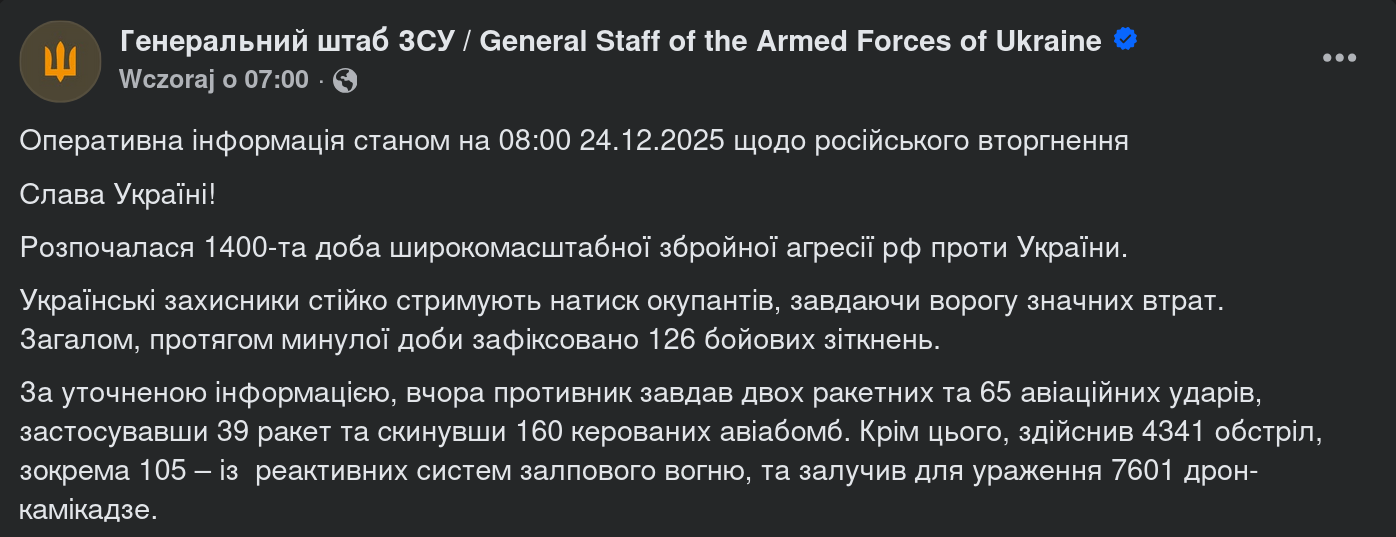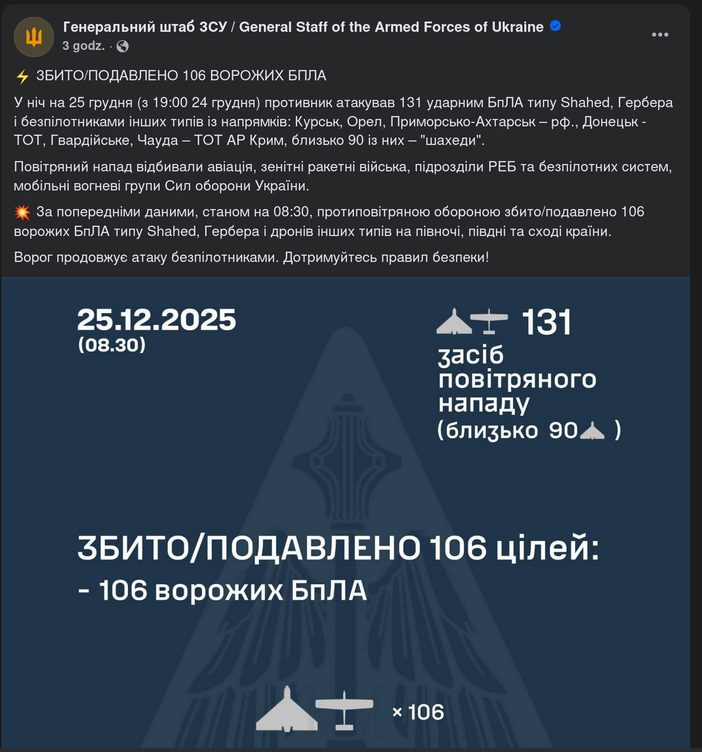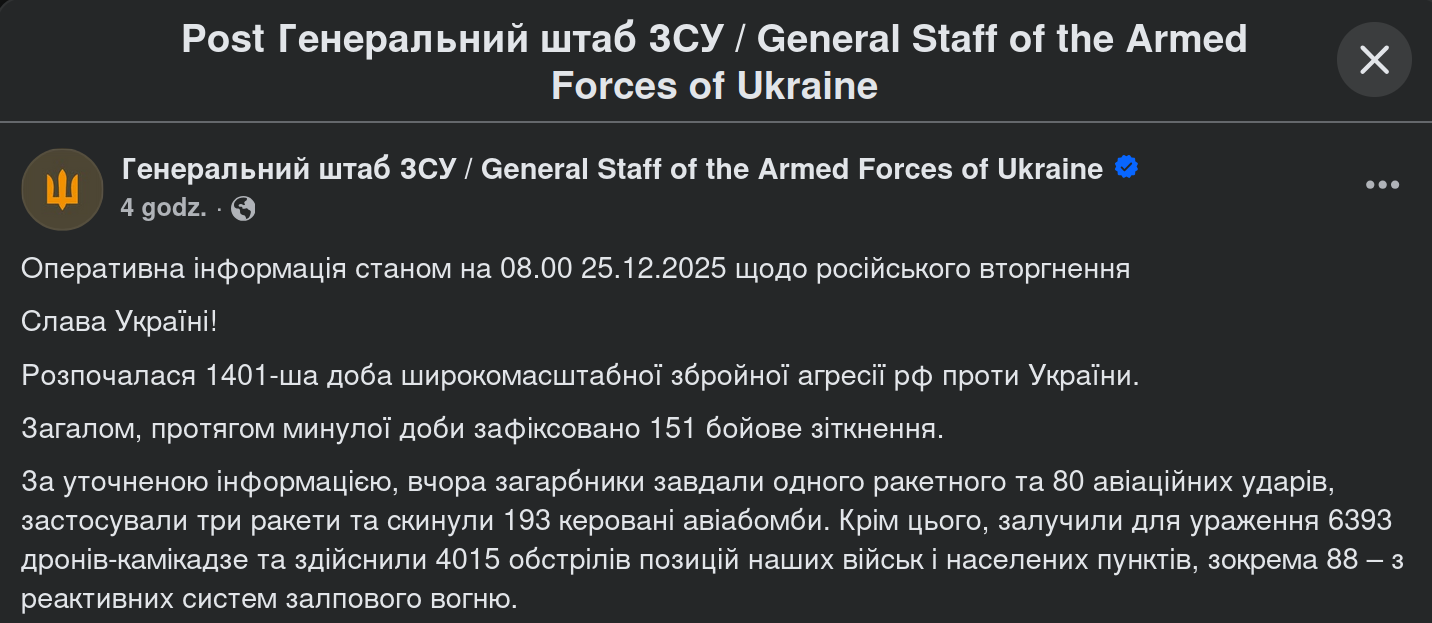 Artykuł - powielany przez różne portale - powołuje się na komunikat Sztabu Generalnego Sił Zbrojnych Ukrainy. I rzeczywiście, znalazłem tam informację o „6393 dronach”. Jest tylko niuans - sztab podał codzienne doniesienie o liczbie samobójczych dronów, wykorzystywanych przez żołnierzy na froncie. Tych „komunijnych”, które dziesiątkują oddziały na pozycjach obu stron, a w przypadku ataków Rosjan także losowych cywilów (czym Rosjanie często się chwalą).