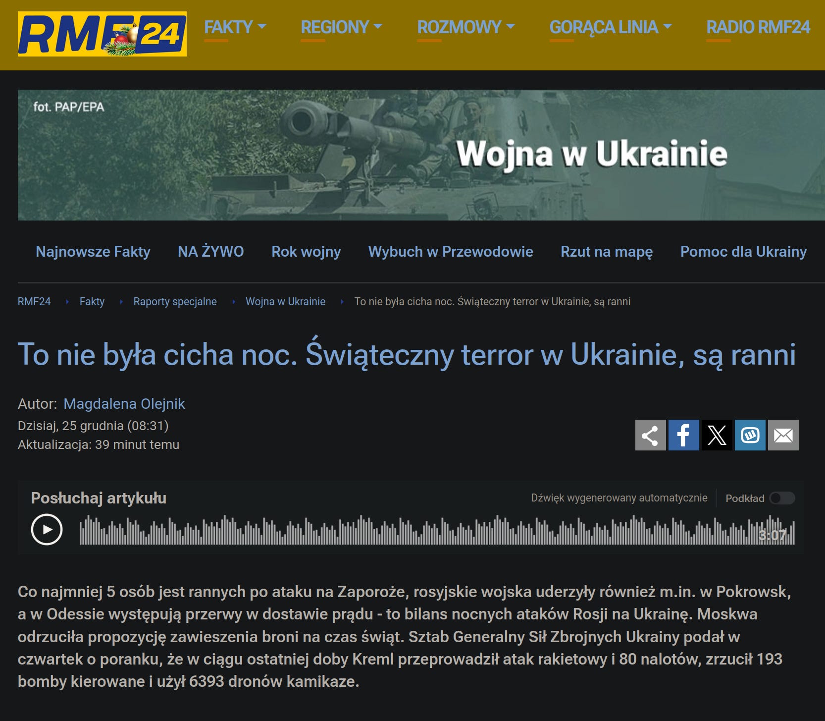 Dziesięć minut później miałem odpowiedź. Pozostaje pytanie, czy mamy do czynienia z dramatyczną niekompetencją, gdy po trzech latach pełnoskalowej, otwartej wojny (która trwa od 2014, ale od 2022 Rosja uderza z pełną siłą i bez krygowania się) pracownicy mediów powielają takie informacje bez mrugnięcia okiem i bez weryfikacji, czy może to hienizm, gdy liczy się wstrząs i efekt „wow” a nie liczy się to, że ta praca pomaga agresorowi, który atakuje także Polskę. A może obserwujemy partaninę, zrzucanie pracy na „AI”, które konfabuluje na potęgę? Niespecjalnie mnie to obchodzi.
