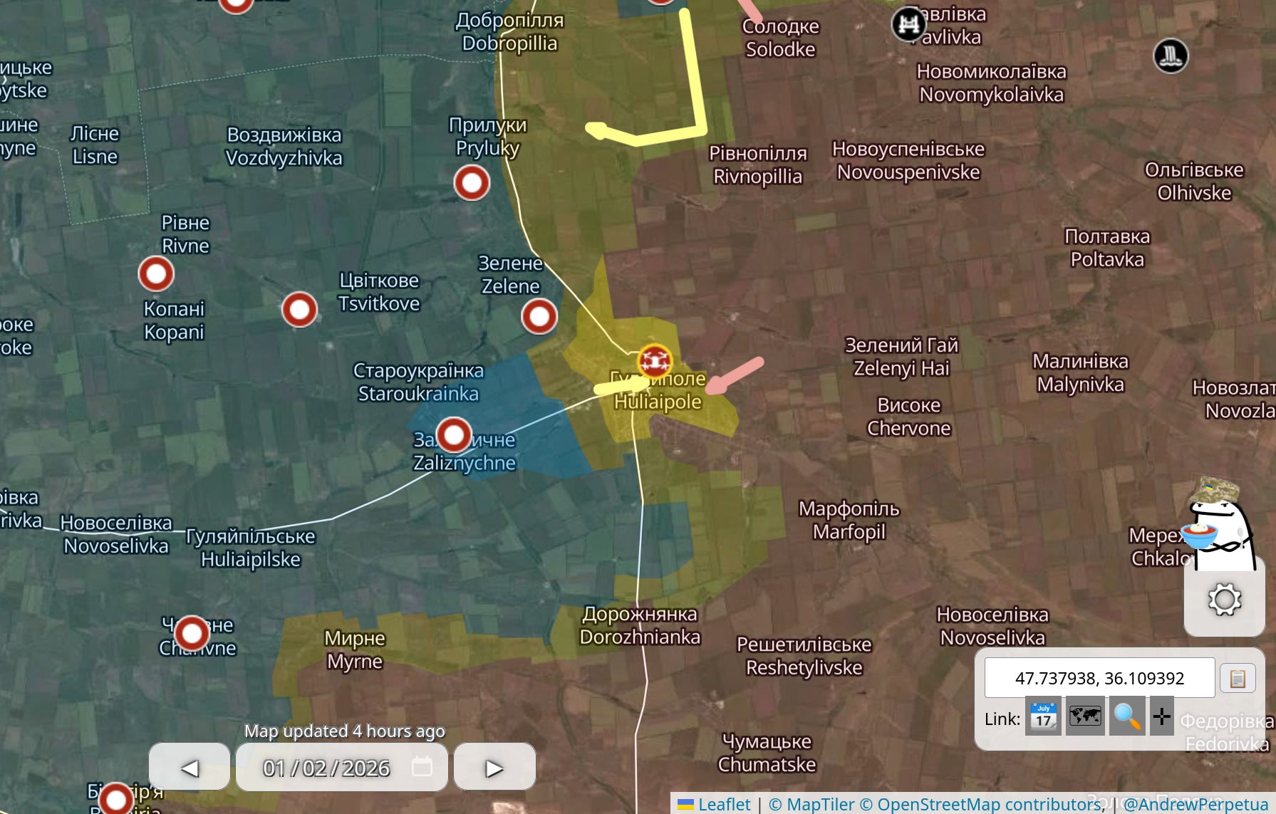 14. Muszę chyba przesortować kolejność, bo lotnictwo i szpiedzy kradną całe miejsce i nie starcza go dla wojsk lądowych. Najpierw okolice Zaporoża. Kiedyś raportowałem stamtąd, odnosząc się do miasteczka Kamiańskie, ale to już dawna przeszłość. Bardzo, bardzo bardzo powoli i bez rzucania się w oczy Rosjanie przepełzli przez Pławne i teraz „szarą strefą” po całości jest Stepnohirśk. To niby jakieś 6 km w ciągu jakiegoś pół roku, ale jednak…