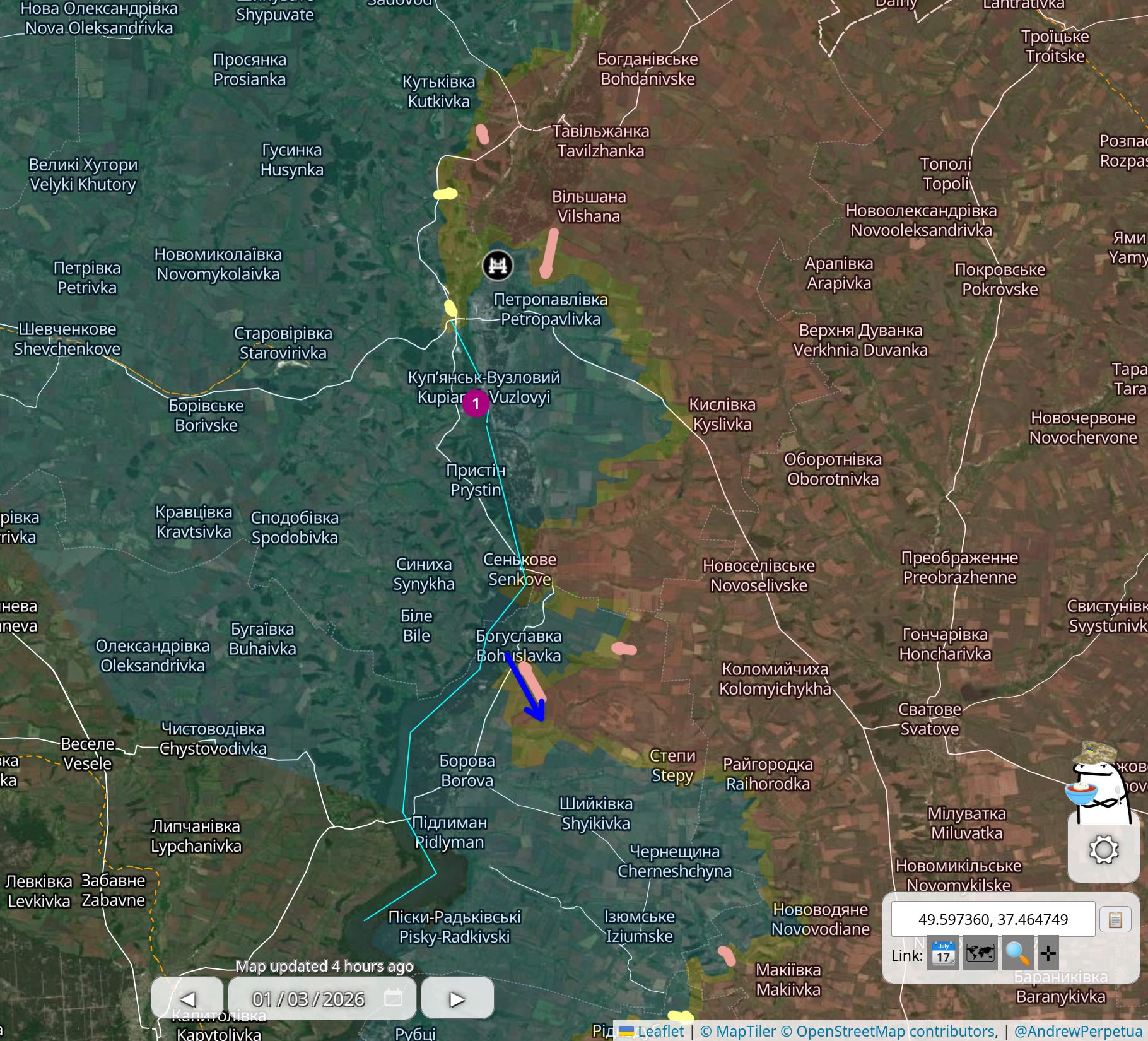 19. Kupiańsk - tu jest o tyle ciekawie, że najnowsze doniesienia, których Perpetua nie naniósł jeszcze na mapę - mówią o ukraińskim kontrataku na południe od Bogusławki - tam, gdzie u Perpetuy jest rosyjska strzałka a u mnie dorysowana niebieska, ukraińska. To są działania za rzeką Oskoł i to jest właśnie ciekawe, jakiś czas temu prorokowałem porzucenie pozycji na wschód od rzeki i jak sami widzicie - tyle są warte proroctwa, już lepiej poprzestawać na byciu kronikarzem ;)