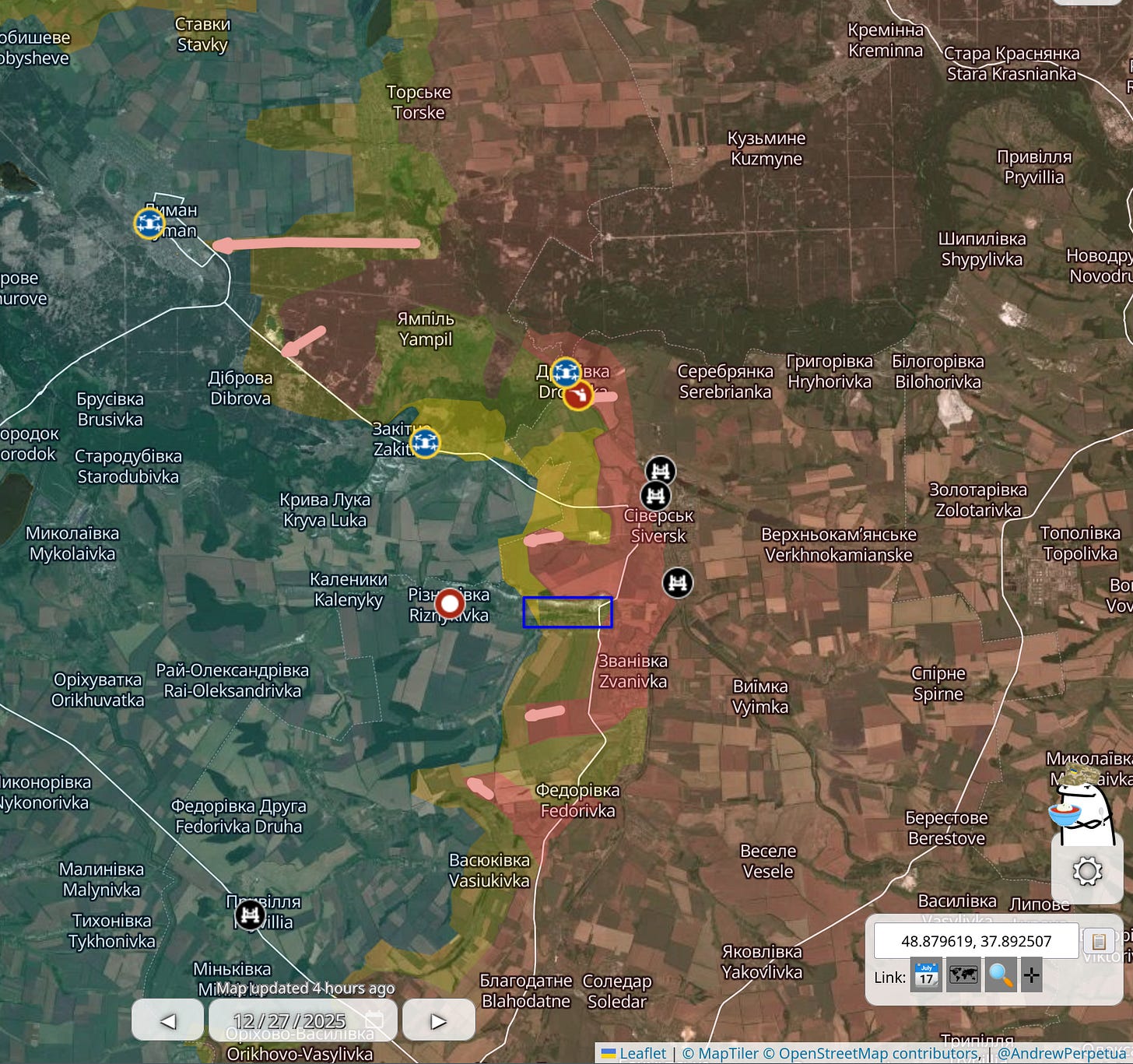 18. Siewiersk. Tutaj Rosjanie, pod koniec zeszłego roku, posunęli się troszkę na szerokim odcinku frontu. Kilka dni temu generał Syrski miał zdymisjonować dowódców 54 Batalionu Zmechanizowanego i 10 Górskiej Brygady Szturmowej, odpowiedzialnych za ten odcinek. Komentatorzy traktują to jednak jako szukanie kozłów ofiarnych i uważają, że za porażkę odpowiada sam Syrski, działający według zasady „skoro sobie radzisz, to oddaj jednostki na kierunki, które sobie nie radzą”. Późniejsze mapy Perpetuy pokazują obecność obrońców w pasku, który zaznaczyłem niebieskim prostokątem, ale wybrałem starszą mapę, bo dobrze pokazuje postępy Rosjan.