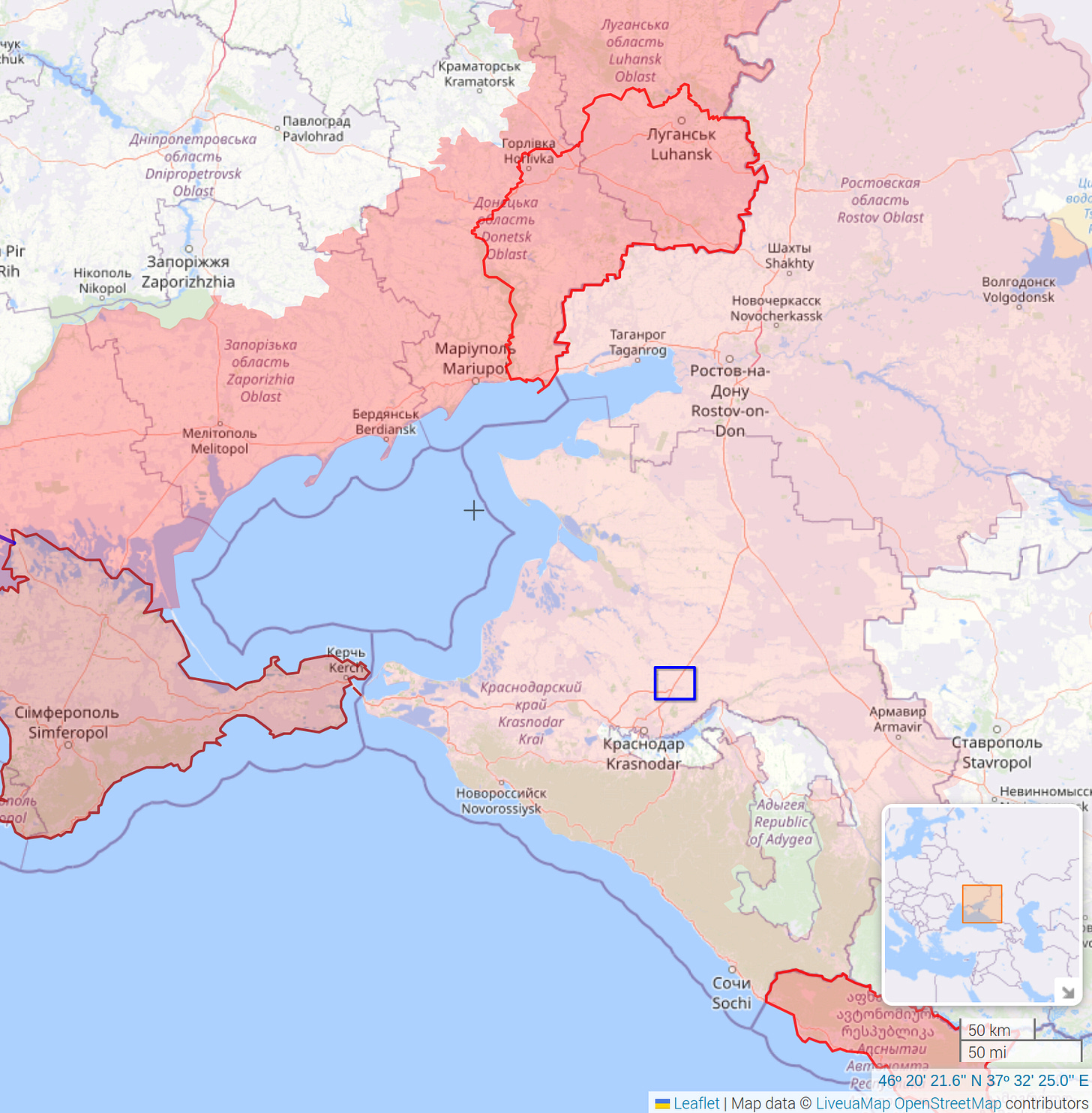 23. Ukraiński wywiad ostatnimi miesiącami pokazuje, że ma bardzo długie ręce i działa nie tylko na całym świecie ale też - bardzo intensywnie - na terytorium Rosji. Kolejną akcją, z której opublikowano oficjalnie nagranie, był zamach na żołnierzy 47 Brygady Rakietowej Sił Zbrojnych FR, przeprowadzony w kraju krasnodarskim, gdzieś w okolicy oznaczonej błękitnym prostokątem.